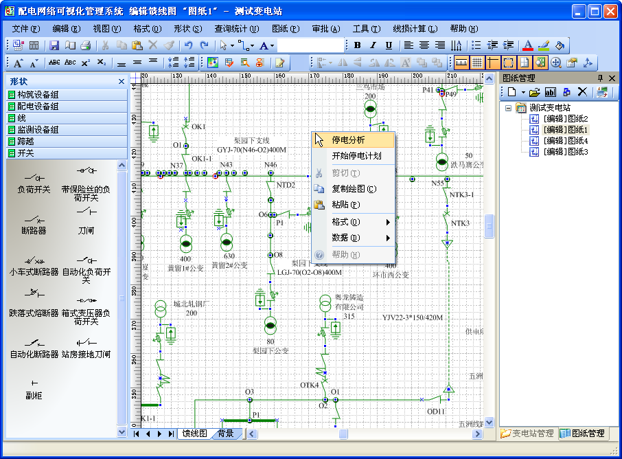 配電網(wǎng)絡(luò)管理可視化系統(tǒng),是按《電氣符號(hào)國(guó)家標(biāo)準(zhǔn)》提供統(tǒng)一的電網(wǎng)圖標(biāo)設(shè)計(jì),具有強(qiáng)大的繪圖功能、饋線圖管理功能、饋線圖的審批流程、在線修改饋線圖、實(shí)時(shí)查看饋線圖、設(shè)備與圖紙緊密結(jié)合、完整的資產(chǎn)管理與強(qiáng)大的資產(chǎn)信息查詢(xún)與統(tǒng)計(jì)功能、電力用戶(hù)信息管理、停電分析功能、線損計(jì)算功能等。