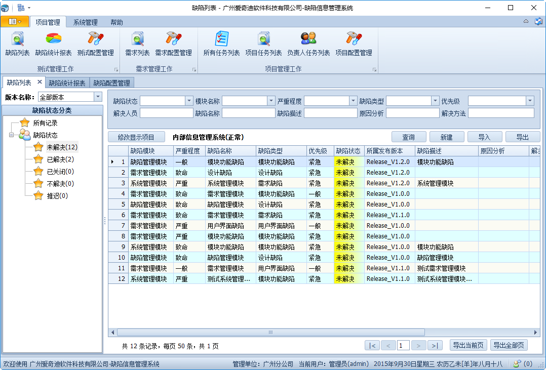 該軟件的功能包括:缺陷的維護(hù)管理(可上傳圖片)、項(xiàng)目列表維護(hù)、模塊列表維護(hù)、版本列表維護(hù)(數(shù)據(jù)字典維護(hù)(缺陷狀態(tài)、缺陷類(lèi)型、緊急程度、優(yōu)先級(jí))、用戶(hù)及功能權(quán)限管理、機(jī)構(gòu)數(shù)據(jù)權(quán)限管理等功能。軟件能夠規(guī)范項(xiàng)目開(kāi)發(fā)過(guò)程中的缺陷記錄跟蹤流程、能夠根據(jù)不同的角色和機(jī)構(gòu)分配不同的缺陷,極大提高項(xiàng)目開(kāi)發(fā)及管理水平。軟件界面美觀大方,方便使用。